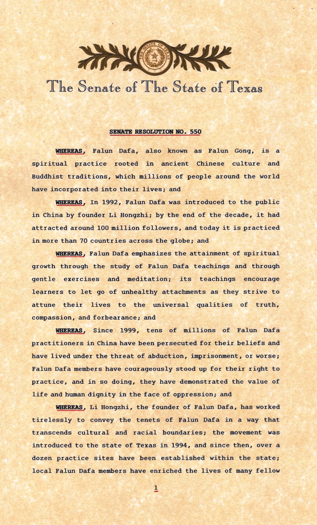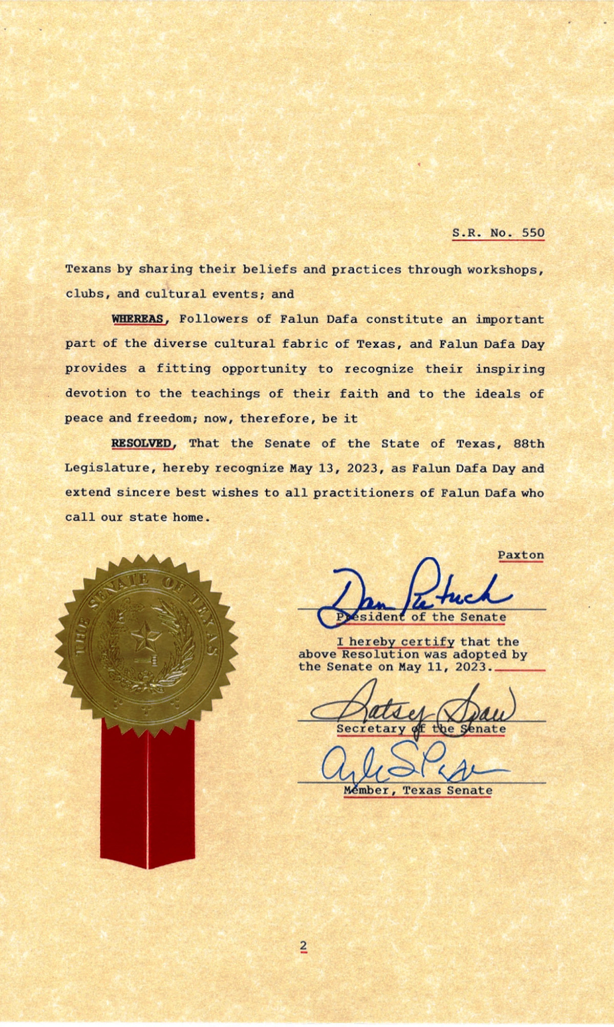 | 【明慧网二零二三年五月十三日】二零二三年是法轮大法弘传世界三十一周年,五月十三日是第二十四届“世界法轮大法日”,暨法轮功创始人李洪志大师华诞。 在这普天同庆的日子里,美国德克萨斯州政要纷纷颁发褒奖贺信,祝贺第二十四届“世界法轮大法日”,他们褒扬法轮大法给德州民众带来更加美好的生活,以及法轮大法修炼者反迫害、捍卫信仰的勇气。 二零二三年五月十一日,德州参议院通过了由德州第八选区参议员安吉拉‧帕克斯顿(Angela Paxton)发起的《第五百五十号决议案》,庆祝第二十四届“世界法轮大法日“,暨法轮大法弘传三十一周年。  图1~3:德州参议院《第五百五十号决议案》 |