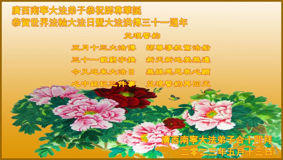 恭贺世界法轮大法日暨大法洪传三十一周年! 兑现誓约 五月十三大法传 师尊导航驾法船 三十一载穹宇换 新天新地美无边 今又迎来大法日 无限感恩表心愿 心中铭记三件事 兑现誓约再回天 广西南宁大法弟子合十叩拜 二零二三年五月八日 广西桂林市高三学生大法弟子恭贺师尊华诞暨世界法轮大法日!