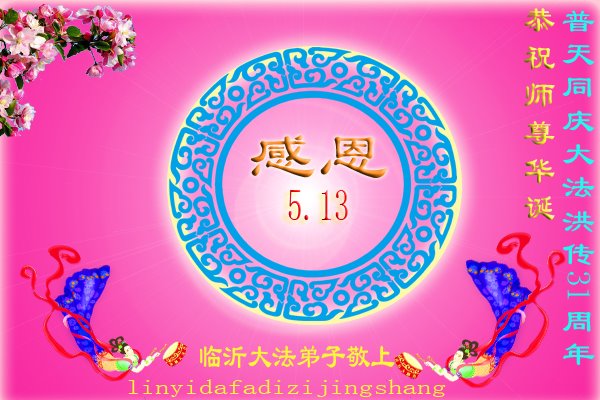 感恩师父的慈悲苦度!敬祝师父生日快乐!普天同祝世界法轮大法日! 山东省临沂市兰山区大法弟子敬贺世界法轮大法日!