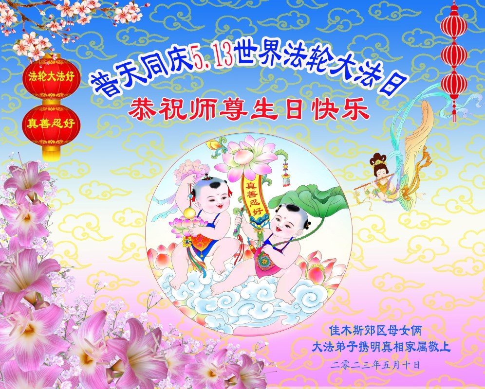 佳木斯市父女俩大法弟子敬上 二零二三年五月七日 黑龙江省佳木斯市母女俩大法弟子恭祝师尊生日快乐!