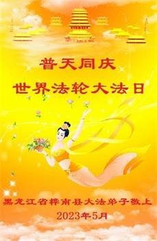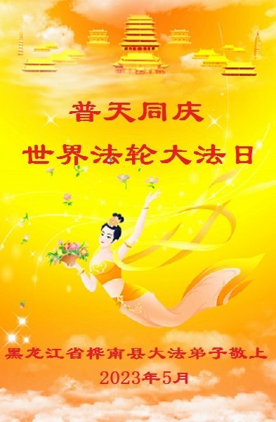 【明慧网二零二三年五月十四日】 黑龙江省佳木斯市桦南县大法弟子同庆世界法轮大法日!庆师尊华诞!