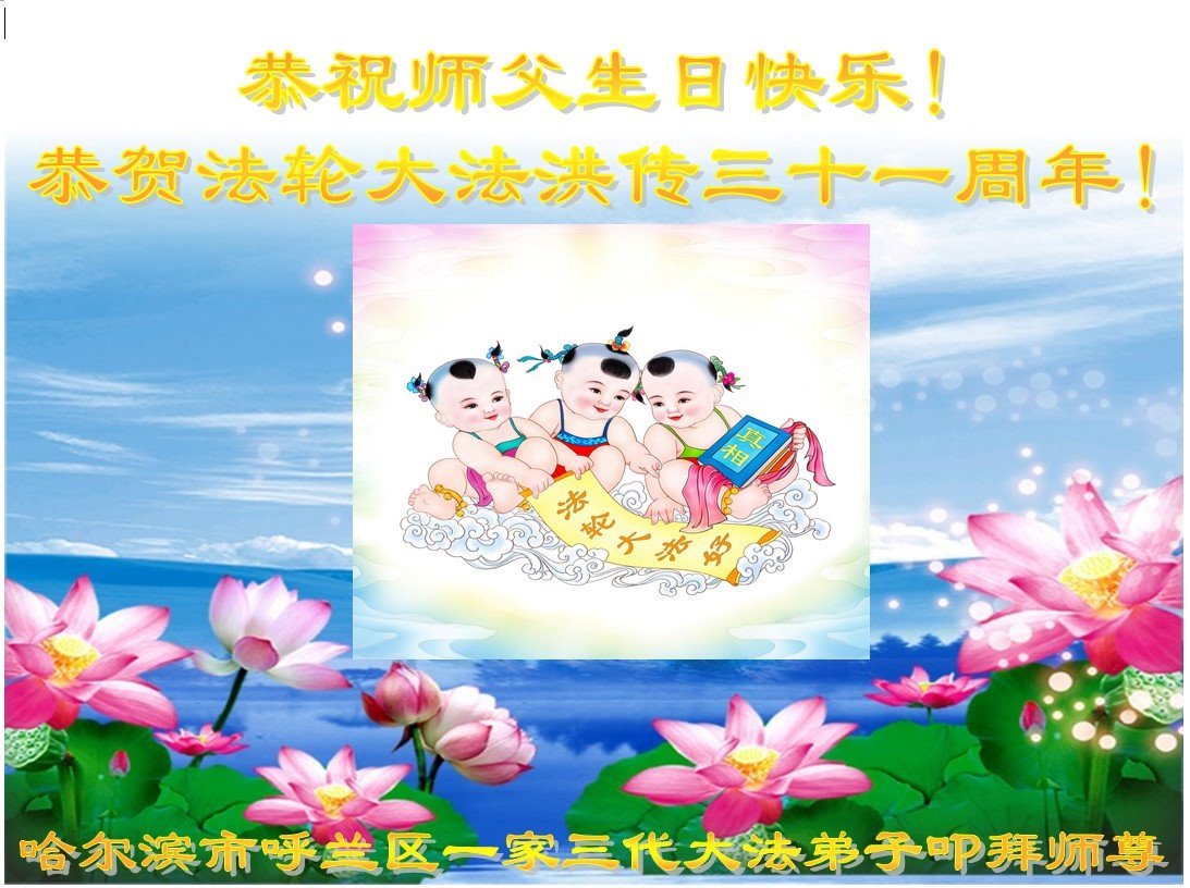 黑龙江省哈尔滨市香坊区一家三位大法弟子恭祝师尊生日快乐!