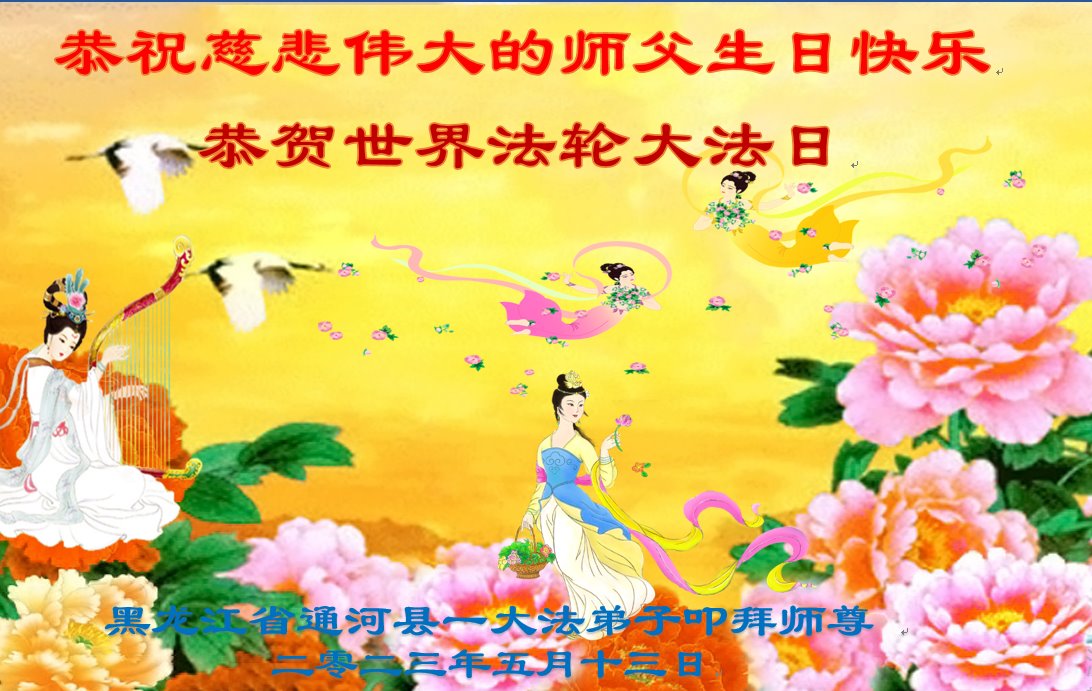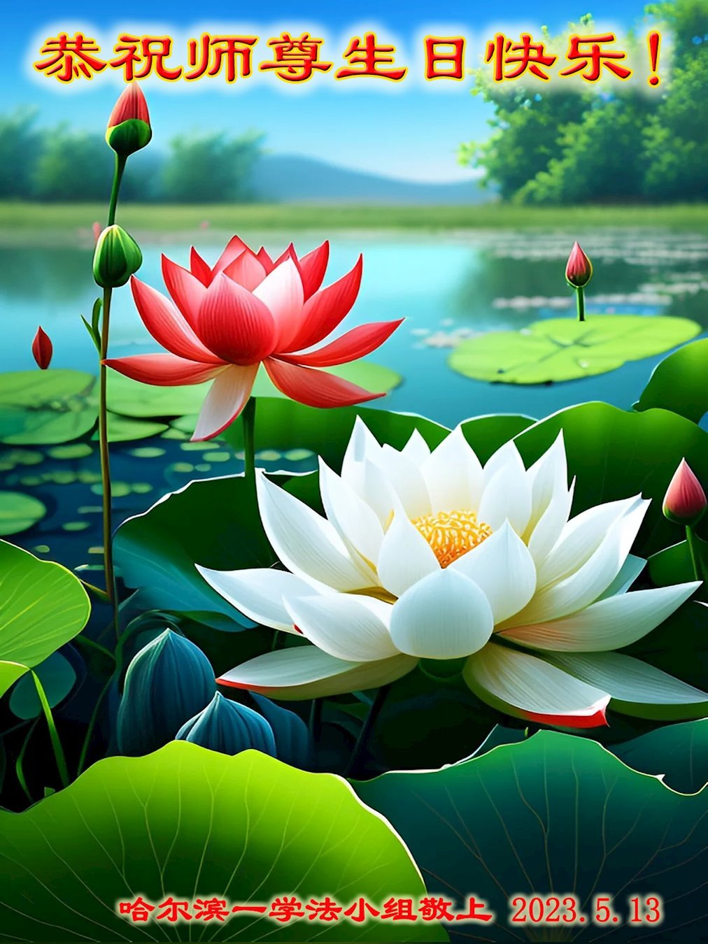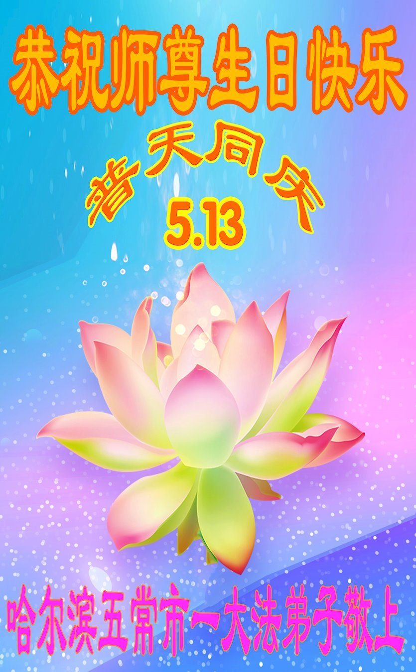 恭贺世界法轮大法日! “五·一三”是个神圣而伟大的日子,是幸福的日子,是万古机缘啊。师尊洪恩浩荡!感恩师尊的慈悲救度。弟子唯有精進实修,正念正行,助师正法,跟师尊返回家园。 弟子叩拜谢师尊 黑龙江省哈尔滨市道外区一学法小组大法弟子恭祝师尊生日快乐!