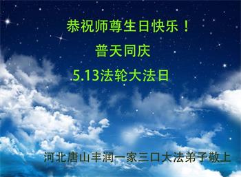 【明慧网二零二三年五月十四日】 河北唐山市丰润区一家三口大法弟子恭贺世界法轮大法日!