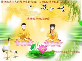 弟子要精進不殆,多救人,不辱使命。 叩谢师父! 河北省唐山市一大法弟子恭祝师尊生日快乐!恭贺世界法轮大法日!