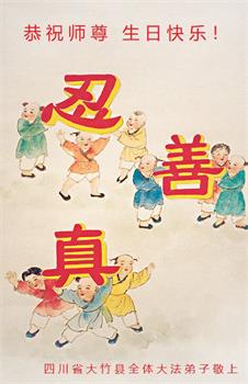 师父您好,弟子心中有千言万语师父什么都知道,在这个特殊神圣的日子里,弟子只能向师父表达无尽的感恩:师父啊,谢谢您!谢谢您把弟子救起,弟子唯有把这颗坚修大法的真心献给您,在大法中不断再精進。谢谢师父!恭祝师父生日快乐!恭贺世界法轮大法日! 四川省射洪市全体大法弟子恭祝师尊生日快乐!恭贺世界法轮大法日!