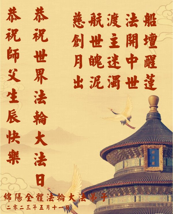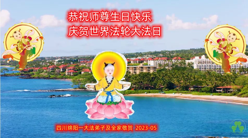 师尊生日好 法轮大法日来到 苍宇同庆天地欢 法正人间已开启 紧随师尊救众生 勇猛精進步不停 全力做好三件事 惟愿师尊笑盈盈 四川省泸州市全体大法弟子贺 2023年5月10日 四川德阳广汉大法弟子恭祝慈悲伟大的师尊生日快乐!