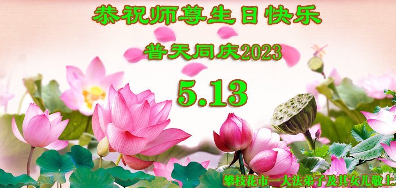 在普天同庆同贺同颂5·13世界法轮大法日暨慈悲伟大的师父华诞之际,弟子恭祝慈悲伟大的师父生日快乐!恭贺法轮大法洪传三十一周年!恭贺第二十四届世界法轮大法日! 弟子衷心感恩慈悲伟大的师父对弟子和家人亲人的慈悲救度和保护帮助!慈悲伟大的师父您辛苦了! 弟子跪拜叩首慈悲伟大的师父浩荡师恩!法轮大法好!真善忍好! 合十 四川省凉山州一大法弟子跪拜叩首敬上 二零二三年五月十二日 四川德阳市一大法弟子恭祝师尊华诞!