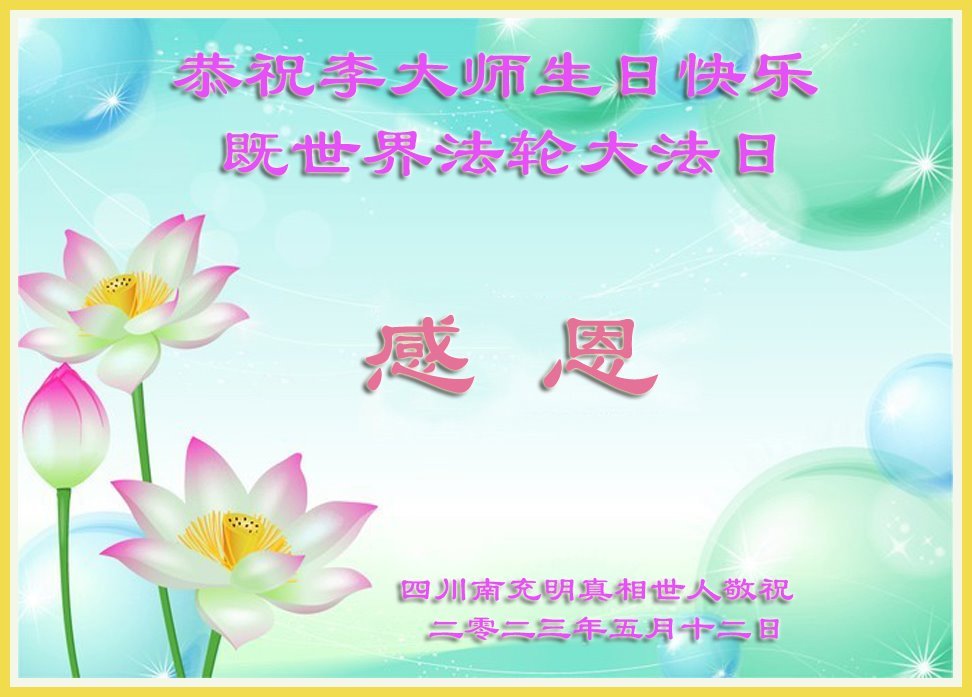 恭贺世界法轮大法日! 四川南充明真相世人祝李大师生日快乐!恭贺世界法轮大法日! 我们听您的弟子讲真相后,诚心敬念“法轮大法好!真善忍好!”得了福报。在您生日到来之际,衷心祝李大师生日快乐!千恩万谢大法师父的救命之恩!让我们身体健康了。希望更多的人也能明真相得福报。感谢李大师的救度之恩。 四川南充三家明真相世人合十敬祝 二零二三年五月十二日 四川乐山全体大法弟子恭祝师尊华诞!