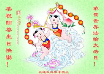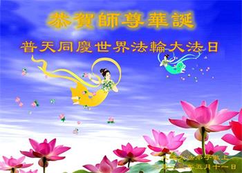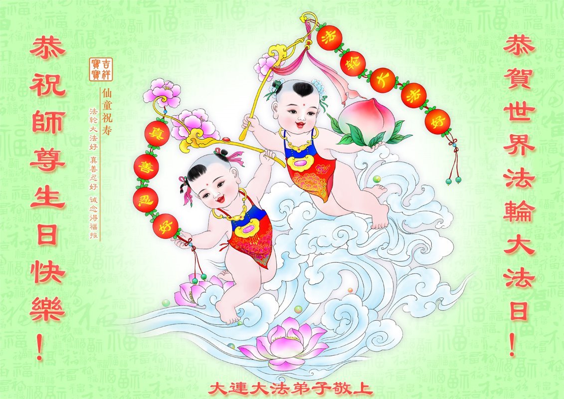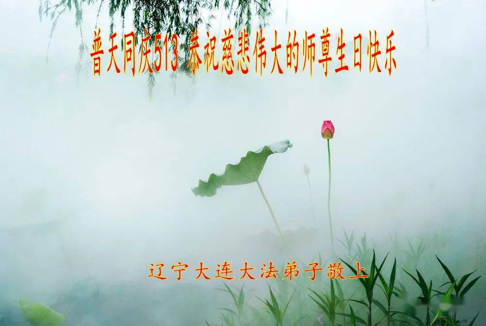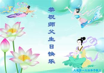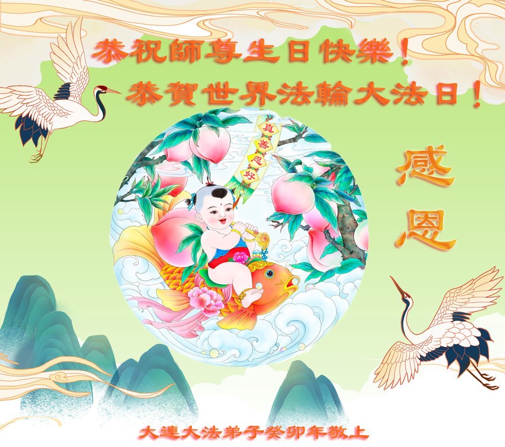 恭贺第二十四届世界法轮大法日! 恭贺法轮大法洪传31周年! 感谢师尊慈悲苦度,时刻保护!感谢师尊为救度世人所付出的一切! 师尊您辛苦啦!弟子一定做好三件事,多做资料多救人。圆满随师回家园! 弟子叩拜师尊 大连大法弟子敬贺 二零二三年五月十二日 辽宁大连市学法小组大法弟子恭祝师父生日快乐!