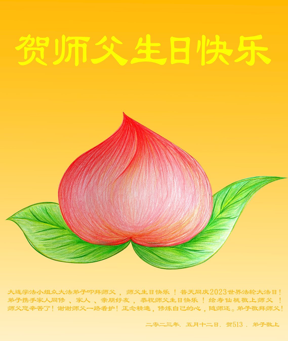 恭贺世界法轮大法日! 师尊您好!师尊您辛苦了! 感恩师尊的慈悲救度,为救众生您付出了自己的一切!一路保护弟子们走到今天,您的洪恩弟子们无以言表,唯有精進,再精進,学好法,做好三件事,多救人。圆满随师还。 弟子们叩拜师尊 合十 二零二三年五月十二日 辽宁大连市甘井子区五位大法弟子恭祝师尊生日快乐!