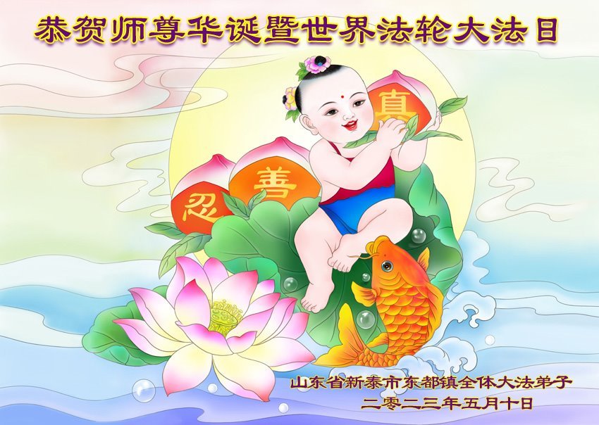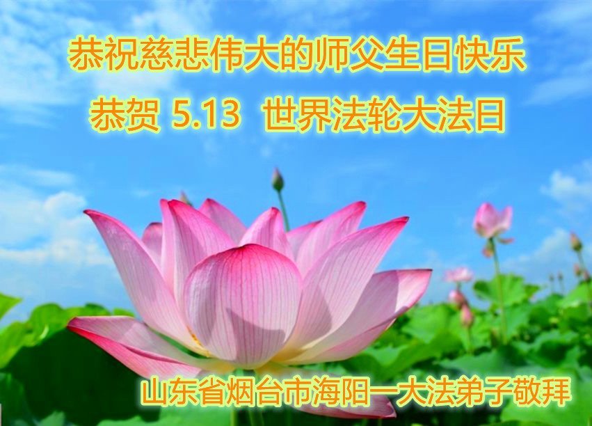 山东某世界五百强会计师青年大法弟子,携家人、亲友、同事敬贺世界法轮大法日!恭祝师尊生日快乐!法轮大法好,真善忍好! 天清地明,五月阳春, 浩荡慈悲,穹苍更新, 创世救度,大法降临, 法徒传真,普天感恩。 一份祝愿,奉献在这法正人间即将到来、一院奇花春有主的大好时刻。当下虽乱世迷离、人心惶慽,是师尊您带领着大法弟子给众生乃至无限苍宇以光明和希望。讲真相救世人是我们的使命,我们会牢记,我们会笃行。真相是救度,真相是希望。 当师尊向世人讲法,很多有学识的世人都在讲,闻听师父讲法,如春雷炸响,从灵魂深处醒来,唤醒了尘封的慧根和夙愿。这是人间不曾有过的绝响,在天地间久久回荡。 叩谢师尊慈悲普度,师父您辛苦了。弟子一定抓紧法正人间来前最后的时光,更好更多的救人讲真相,做好三件事,助师世间行。 山东泰安一大法弟子恭祝师尊生日快乐!暨恭贺世界法轮大法日!