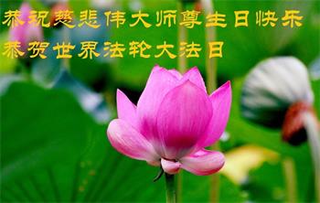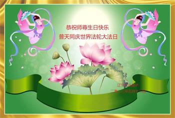 庆祝世界法轮大法日暨大法洪传31周年!恭祝师尊72岁华诞!叩拜感谢恩师慈悲救度! 辽宁两母女俩大法弟子敬上 辽宁省丹东市东港三个大法弟子恭祝师尊华诞快乐!同庆世界法轮大法日!谢谢师父慈悲苦度!