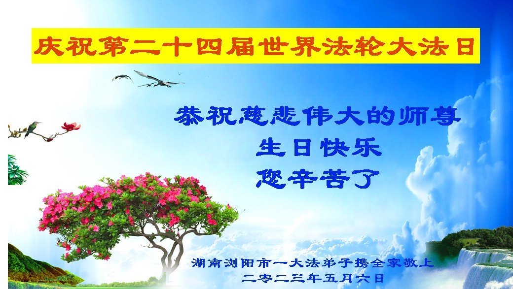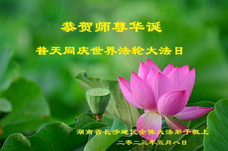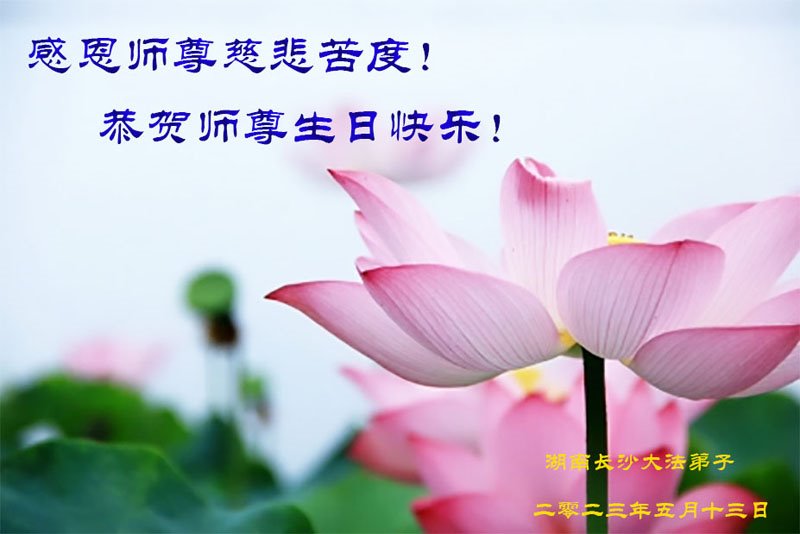 恭贺世界法轮大法日! 恭贺法轮大法洪传三十一周年! 师尊您为宇宙为救度众生太辛苦了!感谢师尊给予的最高圣恩!感谢师尊慈悲的保护在弟子们的身旁,用宇宙大法引领、加持弟子们在修炼的路上不断向前!我虽然修得还不够好,但我深深的明白能成为您的弟子是生命最大的荣幸!我一定要珍惜!抓紧做好三件事,修好自己多救人,履行“证实大法救度众生“这个神圣的使命与责任,用正念正行来回报师尊的救度洪恩。让师尊少一份操劳多一份欣慰,惟愿师尊笑!跟着师尊回家园。 湖南长沙市一大法弟子跪拜敬上 2023年5月11日 湖南长沙大法弟子恭祝师尊生日快乐!