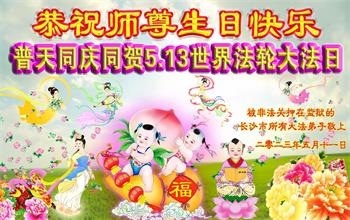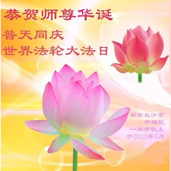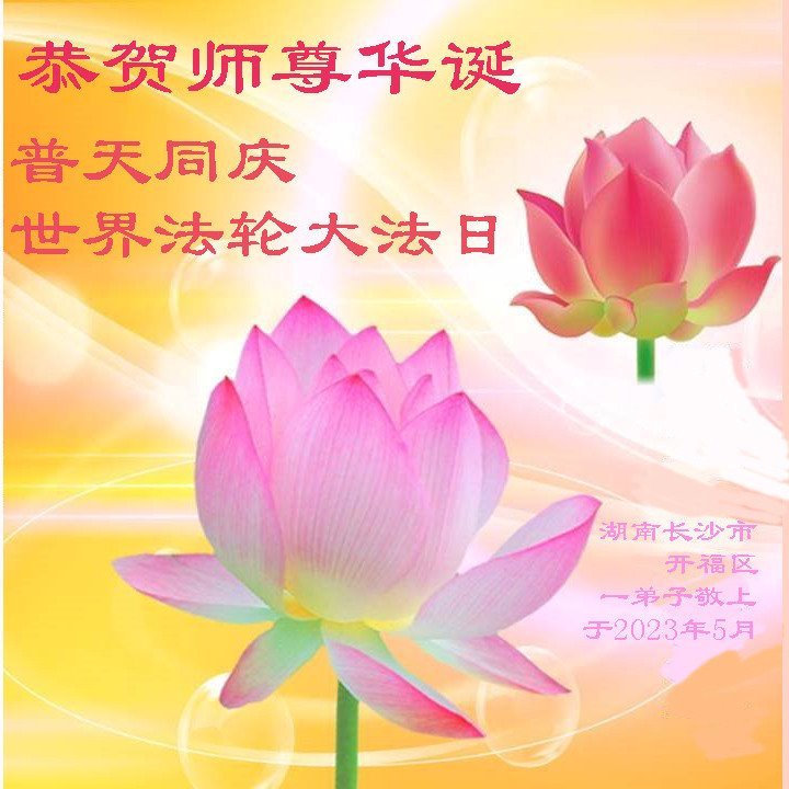 【明慧网二零二三年五月十四日】 湖南省长沙市开福区一弟子恭贺师尊华诞!普天同庆世界法轮大法日!
