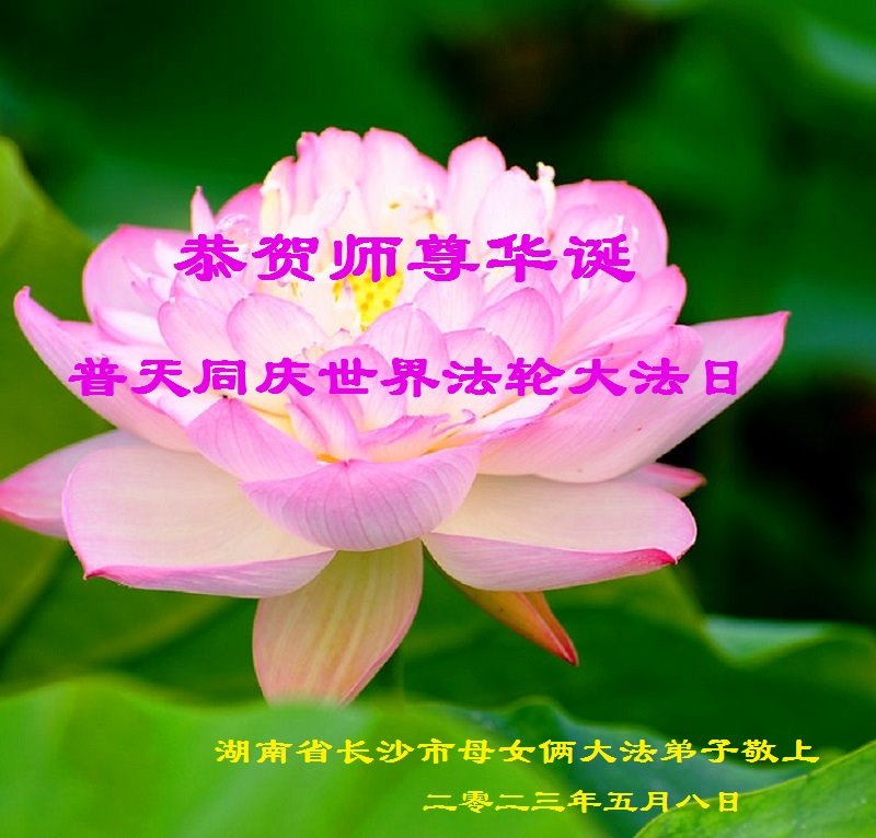在第二十四届世界法轮大法日暨师尊华诞到来之前,我们母女俩弟子跪拜叩谢师尊,感恩师尊,慈悲救度! 师父您辛苦了!无法用人类的语言表达我俩对师父的无限感恩!弟子唯有精進实修兑现誓约多救人,努力做好三件事,以报师恩。 长沙市母女俩大法弟子敬贺 二零二三年五月十日 湖南长沙市大法弟子恭祝师父寿诞暨世界法轮大法日!