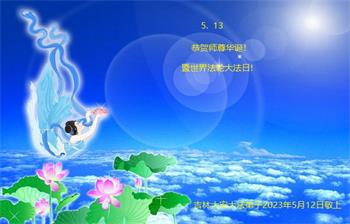 师尊您好!弟子遥拜叩首,恭祝师尊生日快乐!在这普天同庆世界法轮大法日即将到来之际,恭贺法轮大法传世三十一周年。弟子感恩师尊,把罪业深重的我从地狱中捞起,用大法清洗,用大法重塑。弟子一定遵照师尊的教导,做好大法弟子该做的事,一定要跟师尊返回天庭家园。 叩拜师尊 二零二三年五月十日 吉林省白城市大安市三姐妹大法弟子恭祝慈悲伟大的师尊生日快乐!普天同庆世界法轮大法日!叩拜师尊救度之恩!