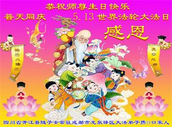 普天同庆第二十四届世界法轮大法日! 四川省成都市都江堰市一大法弟子及家人恭祝师父生日快乐!