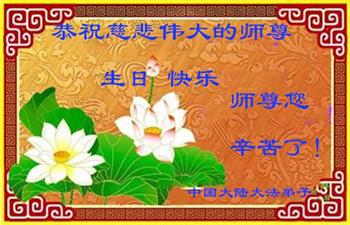 1.感恩师尊慈悲保护才走过重重魔难!感恩不尽师尊无量慈悲苦度和浩荡佛恩! 弟子听师父的话,坚定正念,修好自己,救度众生,恭迎师父回中原! 四川成都温江区大法弟子敬上 2.四川成都崇州大法学员恭祝慈悲伟大的师父华诞! 3.一女大法学员携丈夫、儿子及媳妇一家四口恭祝慈悲伟大的师父生日快乐! 四川成都新都区大法弟子恭祝慈悲伟大的师尊生日快乐!