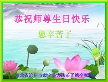 庆贺我们大法弟子的节日5.13的来临,恭祝师父生日快乐! 我们学法小组大法弟子怀着无比崇敬的心,恭祝慈悲伟大的师父生日快乐!师父您辛苦了!跪拜!跪拜!再跪拜! 在以后的时间里我们学法小组大法弟子一起,比学比修,互相提醒修好自己,救度更多的世人。 河北省沧州市东光县一学法小组大法弟子恭贺 河北省沧州市肃宁大法弟子携全家恭祝师尊生日快乐!