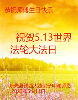 共同庆贺5.13世界法轮大法日!并恭祝师尊生日快乐! 请师父放心弟子们一定修好自己、助师正法、救度世人,不辜负师父的慈悲救度。 河北省沧州市东光县一学法小组全体学员恭贺 河北邢台市临城县大法弟子恭贺世界法轮大法日暨师尊华诞!