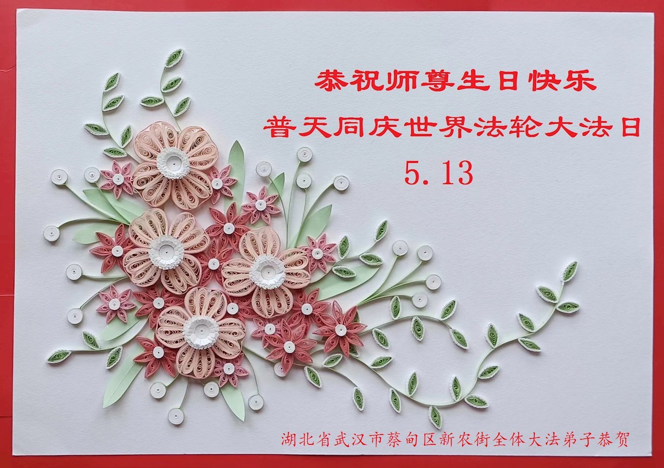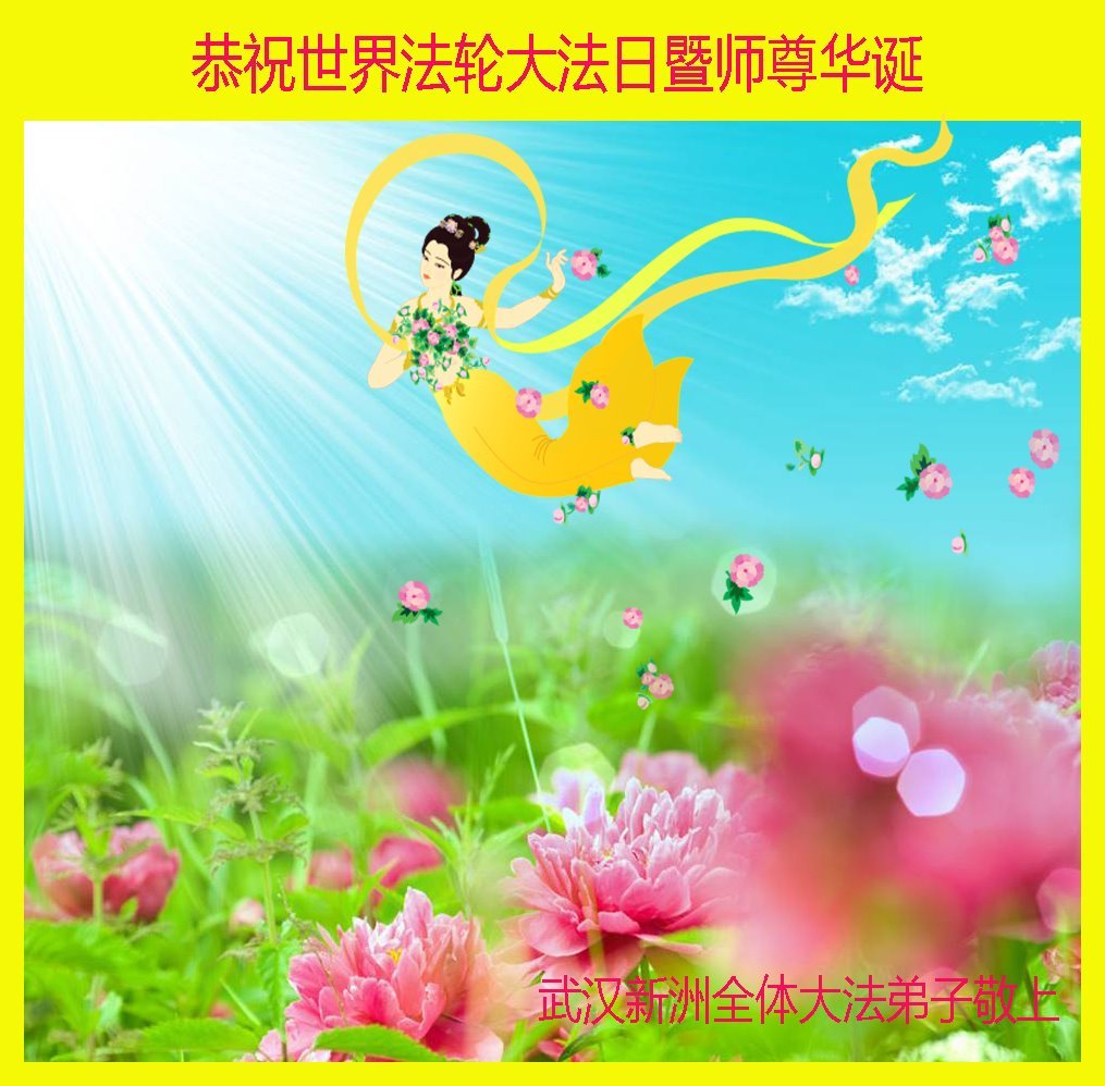 湖北省武汉市蔡甸区新农街全体大法弟子恭祝师尊生日快乐!普天同庆世界法轮大法日! 感谢师尊的慈悲苦度,弟子们在这末后一定精進实修,多救人!合十 叩谢师尊! 湖北武汉大法弟子恭祝师尊生日快乐!