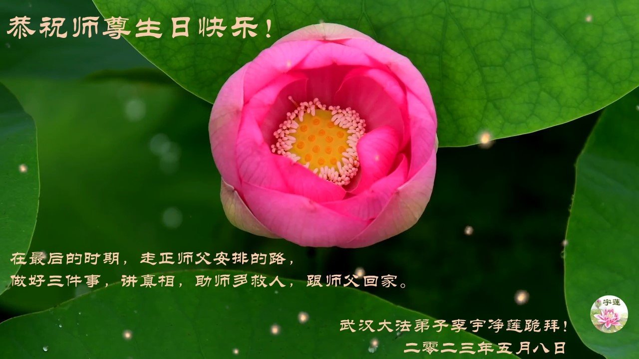 恭祝慈悲伟大的师父生日快乐! 翻天覆地卅一春 寰宇苍茫起浮沉 大法洪传福音到 天女散花满乾坤 世人渐醒阴霾散 找回传统上天门 十方难诉师恩典 叩谢洪恩转法轮 武汉教育系统大法弟子敬贺 2023年5月11日 湖北省武汉市东西湖区一大法弟子恭祝师尊生日快乐!