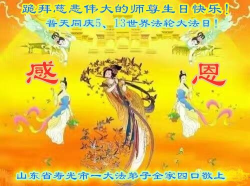 【明慧网二零二三年五月十四日】 山东省潍坊市寿光市一大法弟子全家四口跪拜师尊生日快乐!