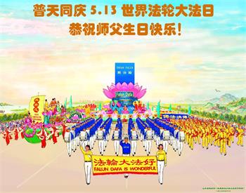 恭祝伟大师尊生日快乐!庆贺世界法轮大法日! 五月的和风送来了伟大师尊的华诞和世界法轮大法日。 苍穹的每个角落都溢满了欢庆和祝愿! 群山起舞,江河欢歌,花儿绽放,草儿摇曳。 大法弟子的心啊,随着法轮的旋转在跳跃,在欢歌。 此时此刻透过感恩的泪水, 我们心中发出时代的最强音: 珍惜与师尊同在的分分秒秒,修好自己,做好三件事, 兑现史前的誓约,用全身心的投入迎接师尊的归来! 让师尊多一份欣慰,少一份操劳! 潍坊教育界大法弟子感恩再感恩! 山东省潍坊市坊子区一学法小组大法弟子恭祝师父生日快乐!