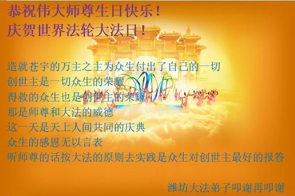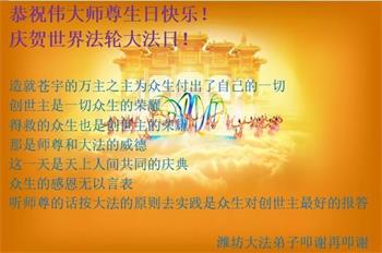 山东省潍坊教育界大法弟子恭祝伟大师尊生日快乐!庆贺世界法轮大法日!