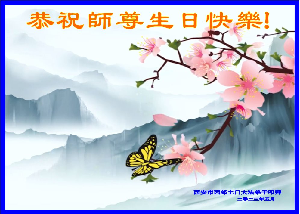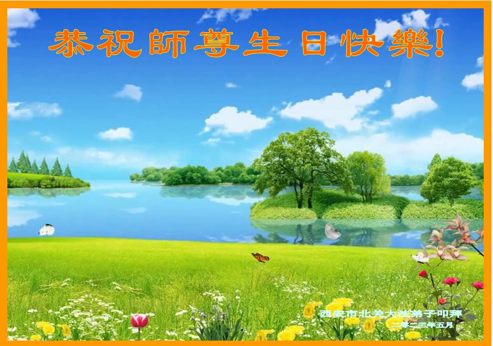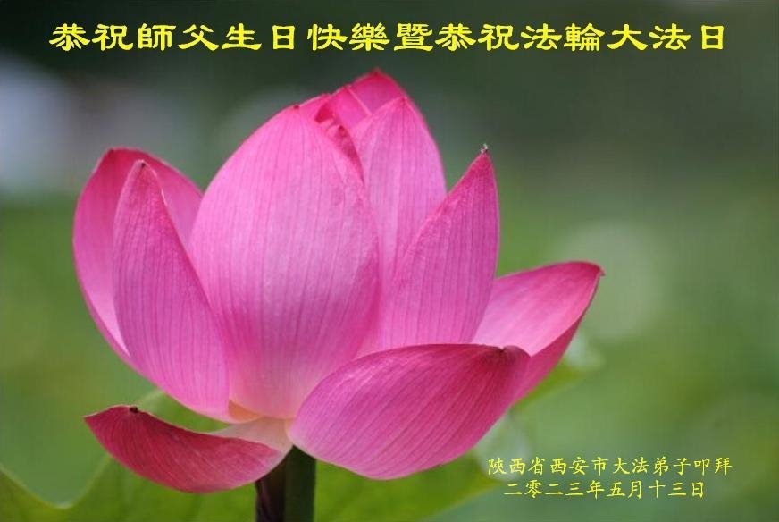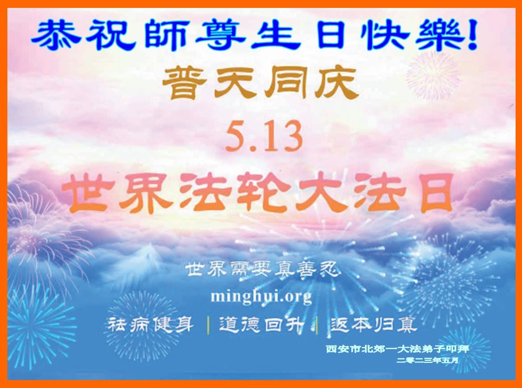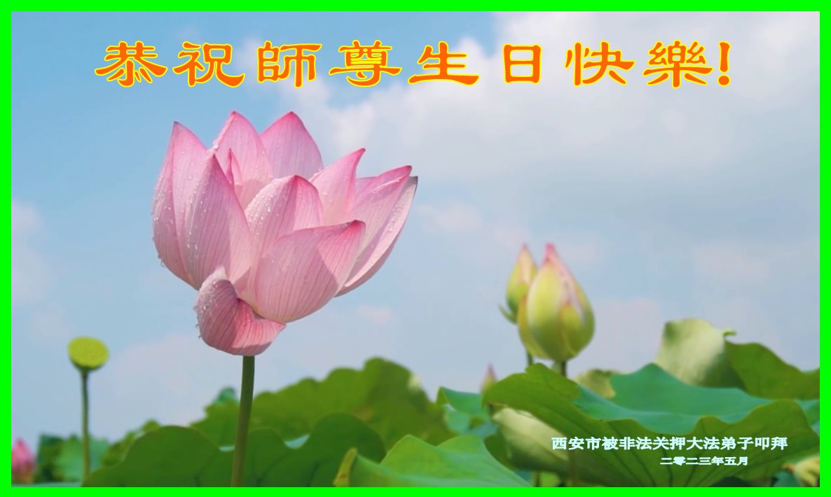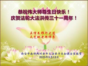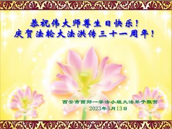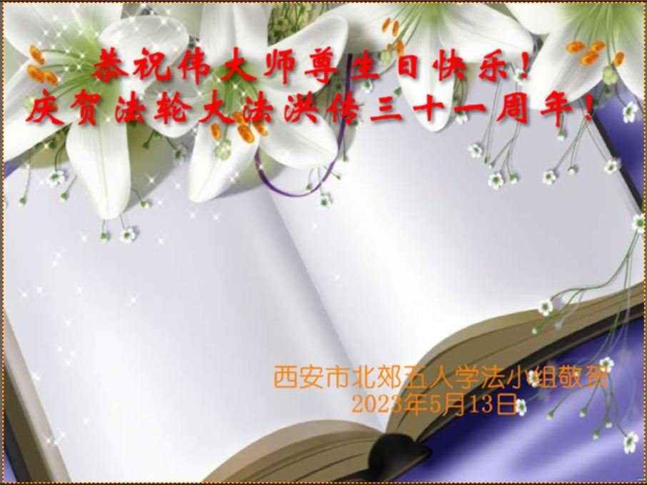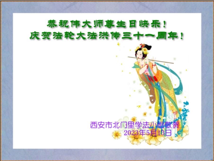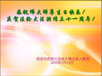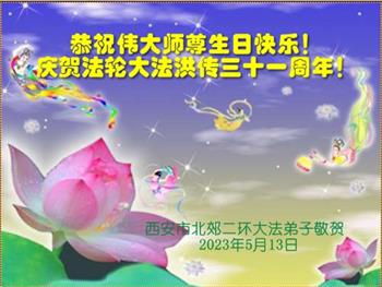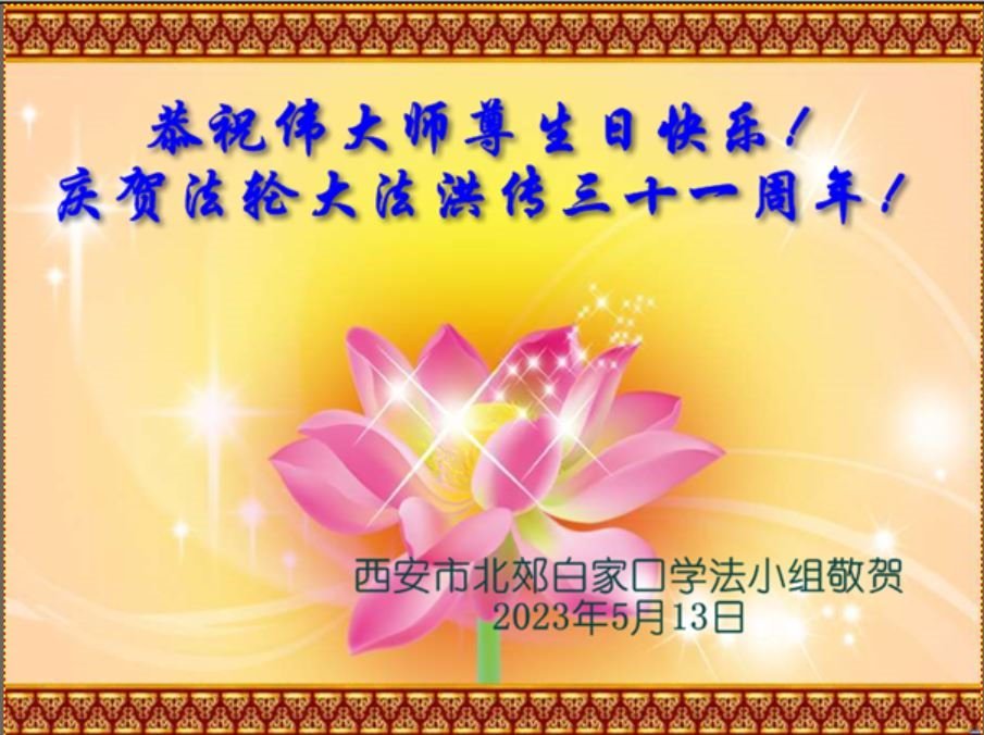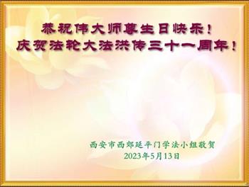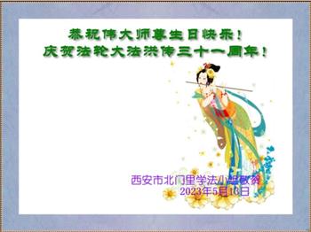 【明慧网二零二三年五月十四日】 陕西西安市北郊二环大法弟子恭祝伟大师尊生日快乐!庆贺法轮大法洪传三十一周年!