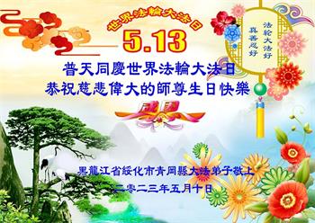 【明慧网二零二三年五月十四日】 黑龙江省绥化市一学法小组全体大法弟子恭贺5·13世界法轮大法日!恭祝师尊生日快乐!