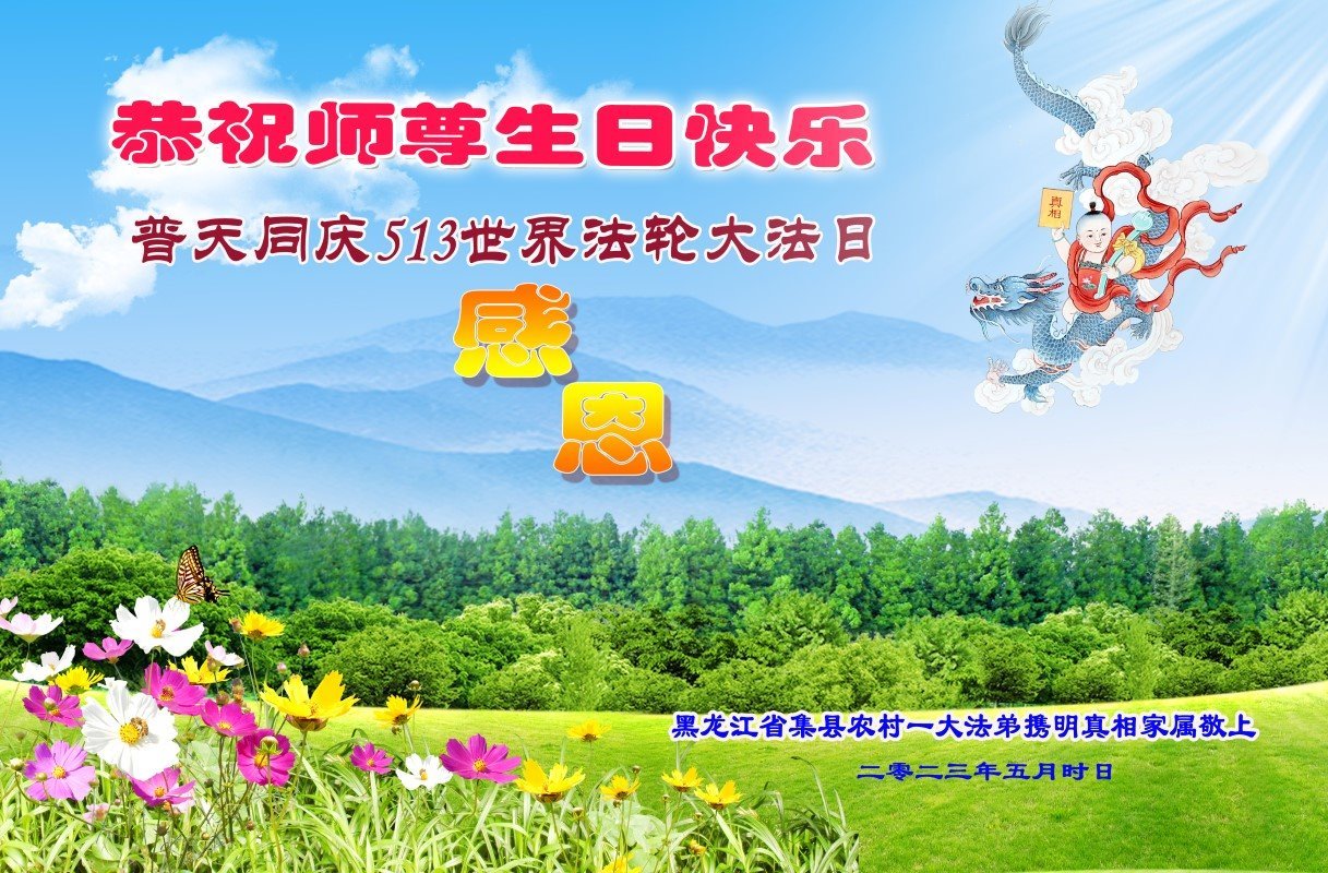 同庆五一三世界法轮大法日! 感恩师尊慈悲救度,师尊您辛苦了,弟子多学法,遇事向内找,多救人做好三件事,跟师尊回家。 黑龙江省集县农村一大法弟子携明真相家属敬上 黑龙江省牡丹江市全体大法弟子恭祝师尊生日快乐!