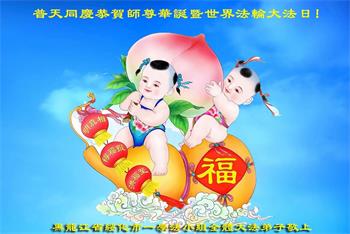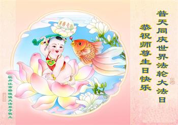 恭贺世界法轮大法日! 在世界法轮大法日到来之际,在普天同庆的盛大节日里,弟子及母亲和女儿以无比感恩之心,恭祝慈悲伟大的师尊生日快乐!祝贺法轮大法洪传世界! 感恩师尊的慈悲救度!感恩师尊一次次将母亲从危难中救起。感恩师尊从地狱中将弟子捞起,洗净、苦度。感恩师尊一路引领看护、点化、保护。今后无论修炼的路有多长,多难,弟子一定紧随师尊坚修大法到底。 叩拜恩师 大陆大法弟子敬贺 黑龙江省伊春市金林区一学法小组大法弟子恭祝慈悲伟大的师尊生日快乐!