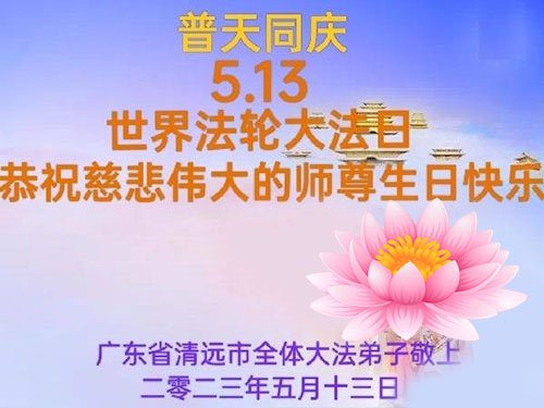 师尊好!弟子感受到您对弟子们及世人的洪恩,弟子一定修好自己,不辜负师尊的慈悲苦度!弟子叩拜! 广东省清远市全体大法弟子恭祝师父生日快乐!