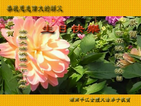 感恩师父慈悲救度,恭祝师尊生日快乐!永展笑颜。 双手合十 湖南省衡阳市石鼓区一大法弟子携女儿及家人跪拜恭贺法轮大法日!