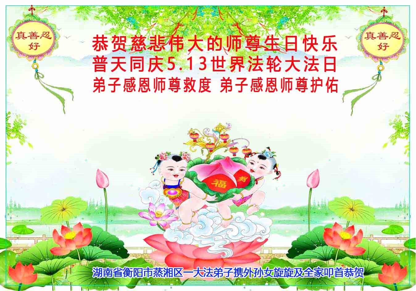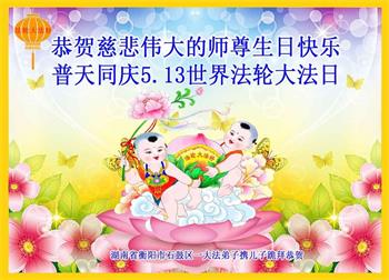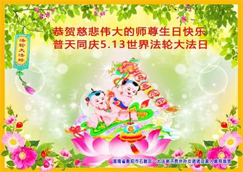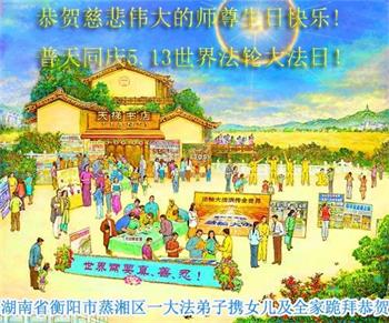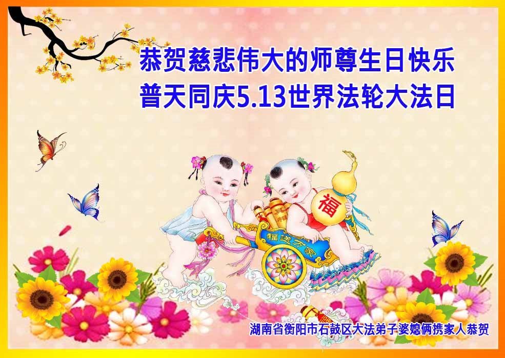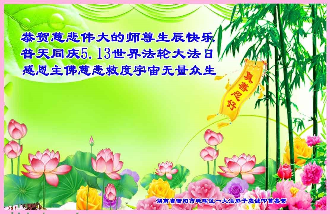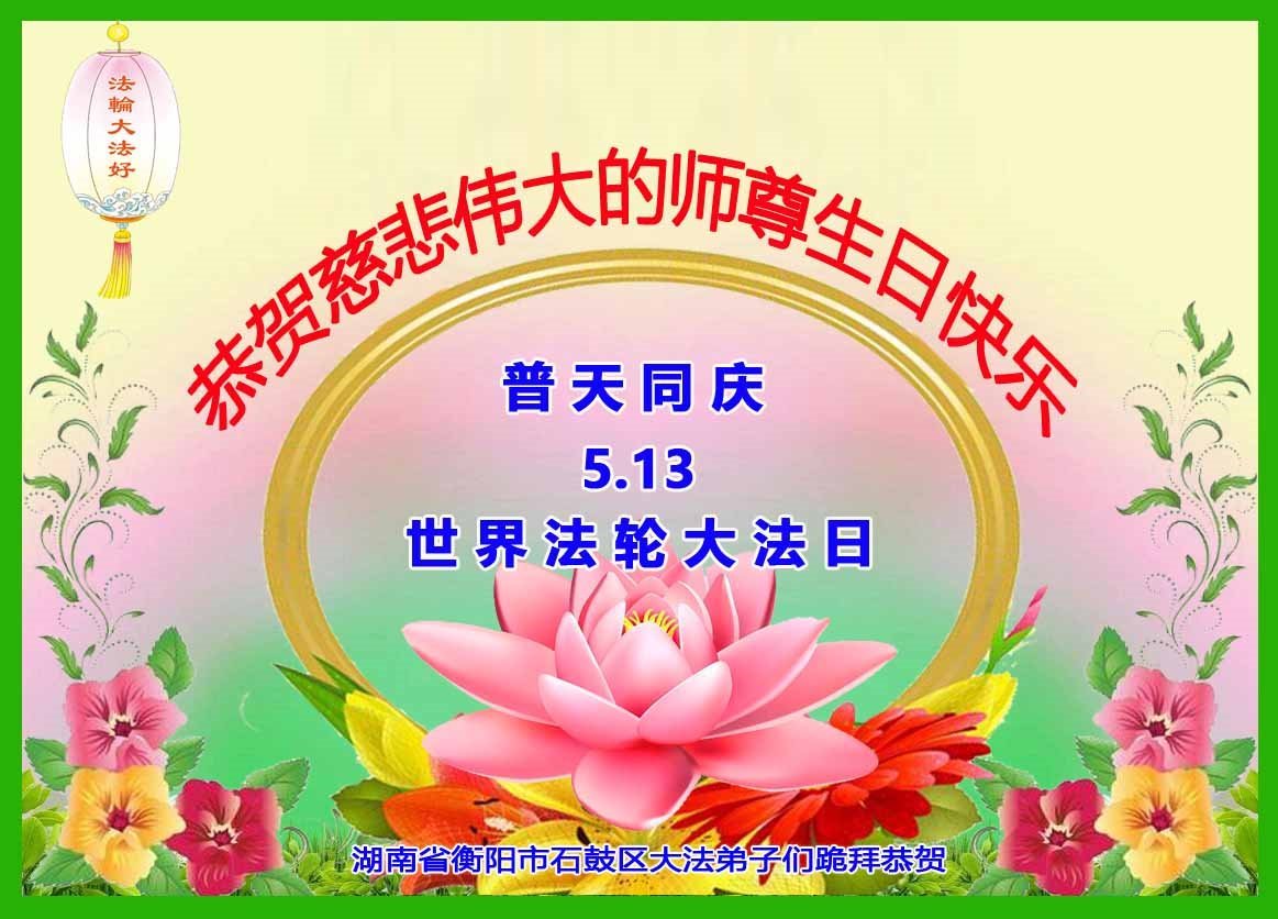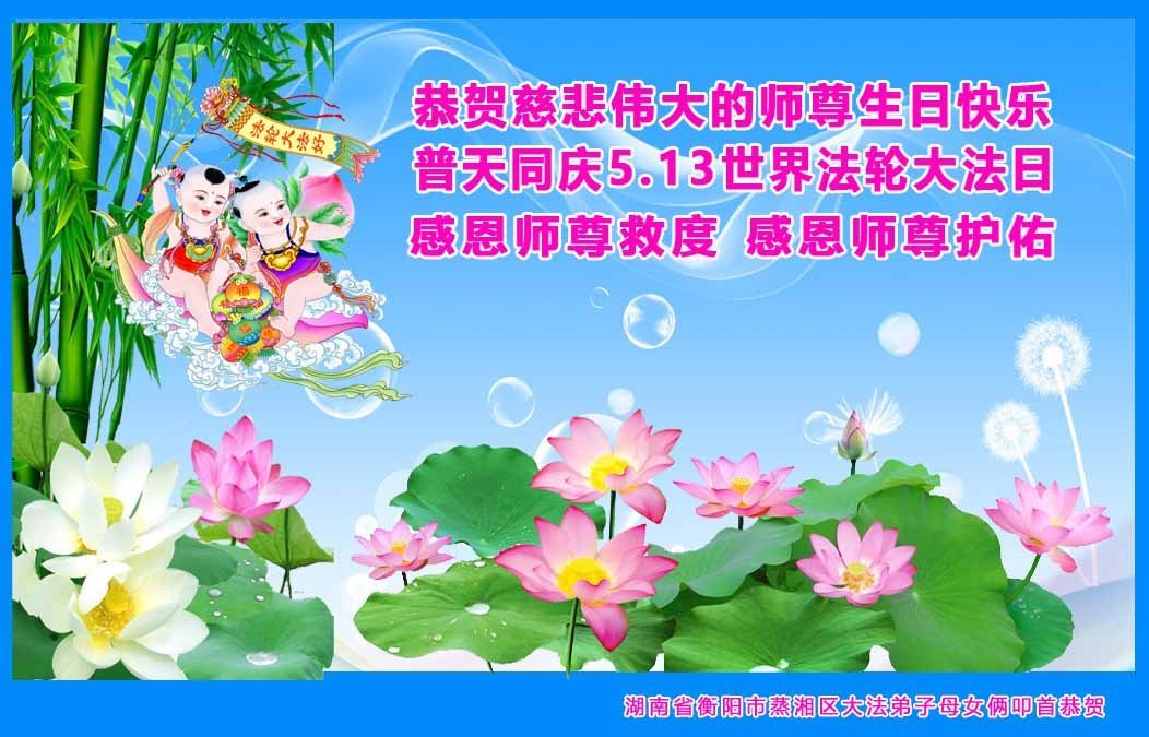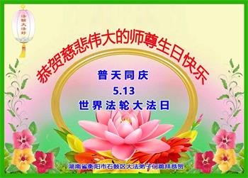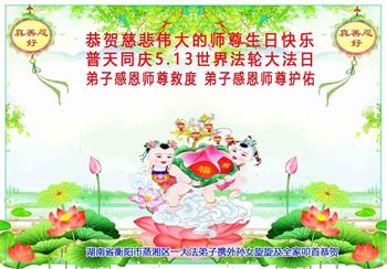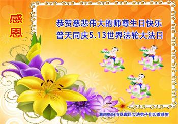 湖南省衡阳市珠晖区大法弟子们叩首恭祝慈悲伟大的师尊生日快乐!普天同庆5.13世界法轮大法日! 湖南省衡阳市珠晖区一大法弟子恭贺法轮大法日!