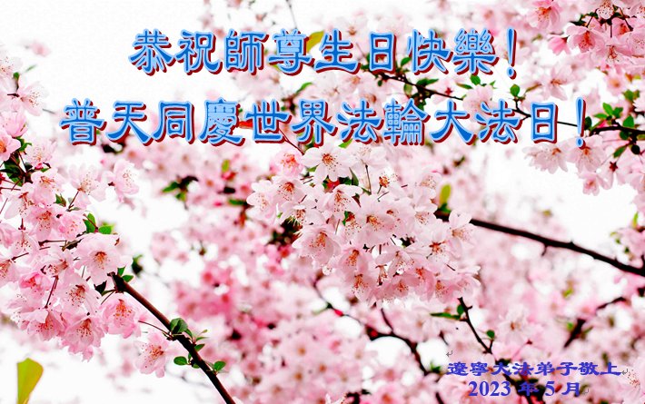 祝贺世界法轮大法日二十四周年!祝贺法轮大法洪传三十一周年! 5.13是个伟大的日子! 是个殊胜的日子! 是个世人瞩目的日子! 是个万古流芳的日子! 感谢师父把这么好的大法传给我们,弟子无以回报师父的救度之恩,只有精進实修,做好三件事,不辱使命,圆满随师还。 辽宁鞍山市立山区一老年大法弟子叩拜师尊! 2023年5月12日 辽宁省丹东市孤山地区大法弟子恭祝慈悲伟大的师尊生日快乐!
