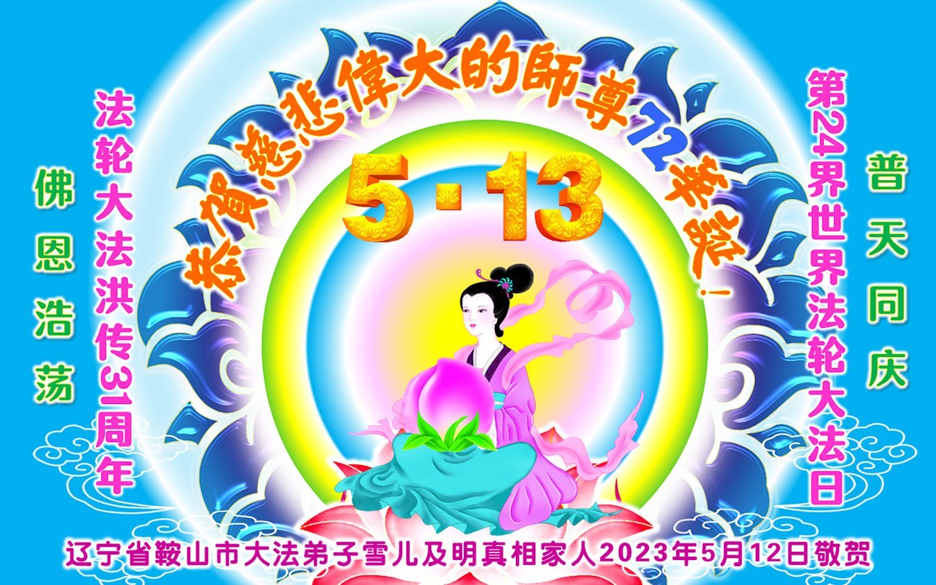 普天同庆5∙13世界法轮大法日!庆祝法轮大法弘传31周年!徒儿叩谢恩师的慈悲救度,正法接近尾声,弟子一定加倍努力做好,兑现史前的誓约,不辱使命,修好自己,将三件事放在首位,配合整体,放下自我,在一思一念上下功夫,彻底放下常人的执着,圆满随师把家还。 落入凡尘名利情 满身污秽难洗清 感恩师尊传大法 再造神体出大穹 真善忍心中扎根 衡量标准新已定 法轮旋转败物灭 期盼新宇返家园 谢师恩无限感恩 泪满襟叩谢师尊 法轮大法盛世传 再创新宇新纪元 鞍山市大法弟子及明真相家人敬贺 2023年5月12日 辽宁省丹东市一大法弟子及女儿恭祝慈悲伟大的师父生日快乐!恭贺世界法轮大法日!
