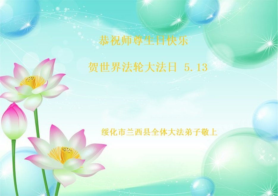 恭贺5·13世界法轮大法日! 法轮大法好!真善忍好!师尊辛苦了! 请师父放心,弟子们尽量多救人,魔难中一切都有师父管。弟子会更精進,多学法,精進实修自己,放下执着心,做好三件事,不辜负师尊的慈悲救度,圆满跟师父回家。 绥化市一老年七人学法小组大法弟子叩拜 二零二三年五月十一日 黑龙江省绥化市兰西县大法弟子恭祝师尊生日快乐!恭贺世界法轮大法日!