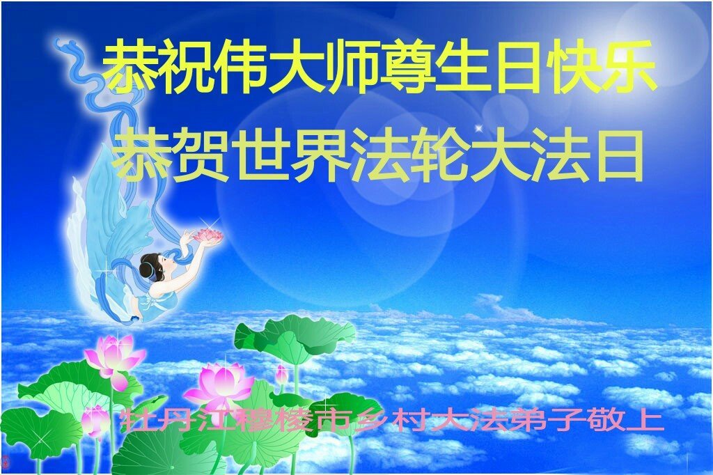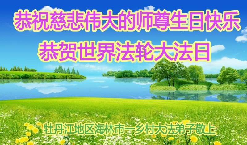 我是一乡村大法弟子,我和我村明真相的世人恭祝慈悲伟大的师尊生日快乐!同祝世界法轮大法日!感恩师尊慈悲救度! 黑龙江省牡丹江一大法弟子恭祝慈悲伟大的师尊生日快乐!同祝世界法轮大法日!感恩师尊慈悲救度!