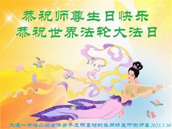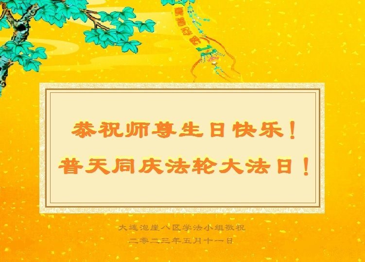 大连泡崖八区学法小组大法弟子敬祝 二零二三年五月十一日 辽宁省大连市甘井子区一大法弟子及全家人恭祝师尊生日快乐!恭贺法轮大法洪传三十一周年!