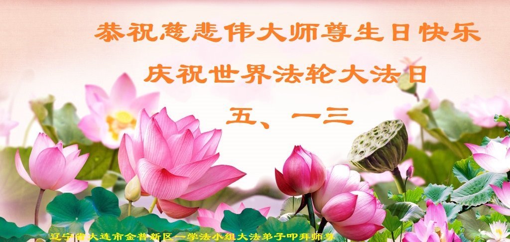恭祝慈悲伟大师尊生日快乐!庆祝世界法轮大法日五·一三! 师父辛苦了!感恩师父救度之恩,我们学法小组大法弟子一定学好法,做好三件事,跟师父回家。 辽宁省大连市金州区光中街道大法弟子恭祝慈悲伟大的师尊生日快乐!