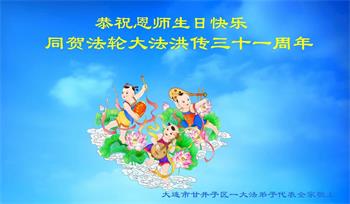 在大法弘传三十一周年之际,也是慈悲伟大师尊的华诞,在这里,大连大法弟子母女祝慈悲伟大的师尊生日快乐!千言万语述不尽对师尊的感恩,弟子只有精進实修,做好三件事,回报师尊的慈悲救度。谢谢师尊!叩拜师尊! 辽宁省大连市16名大法弟子恭贺世界法轮大法日暨师尊华诞!