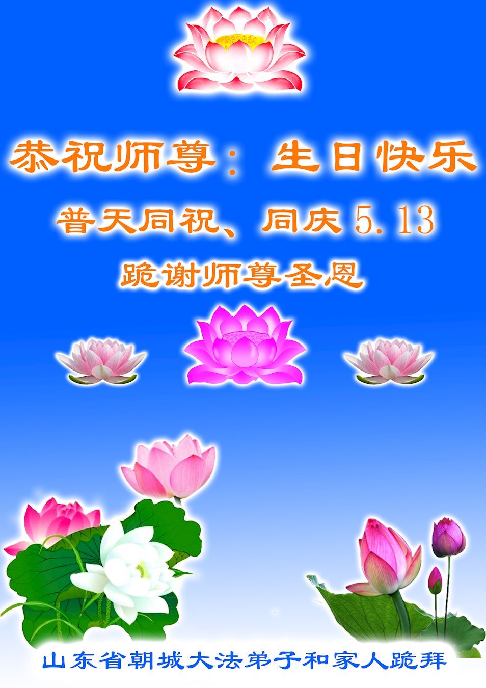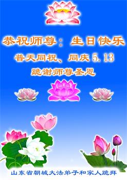 庆祝世界法轮大法日! 祝师父生日快乐!谢谢师父对弟子们的慈悲保护!弟子们一定会修好自己,做好三件事,请师父放心。 山东大法弟子恭祝伟大的师尊生日快乐!