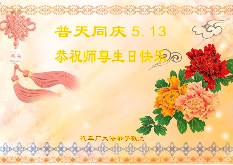 师父生日快乐!谢谢师父为众生付出的一切!弟子唯有不断努力做好三件事,以谢师恩! 吉林省长春一老年大法弟子及外孙恭祝恩师生日快乐!恭祝5·13世界法轮大法日!