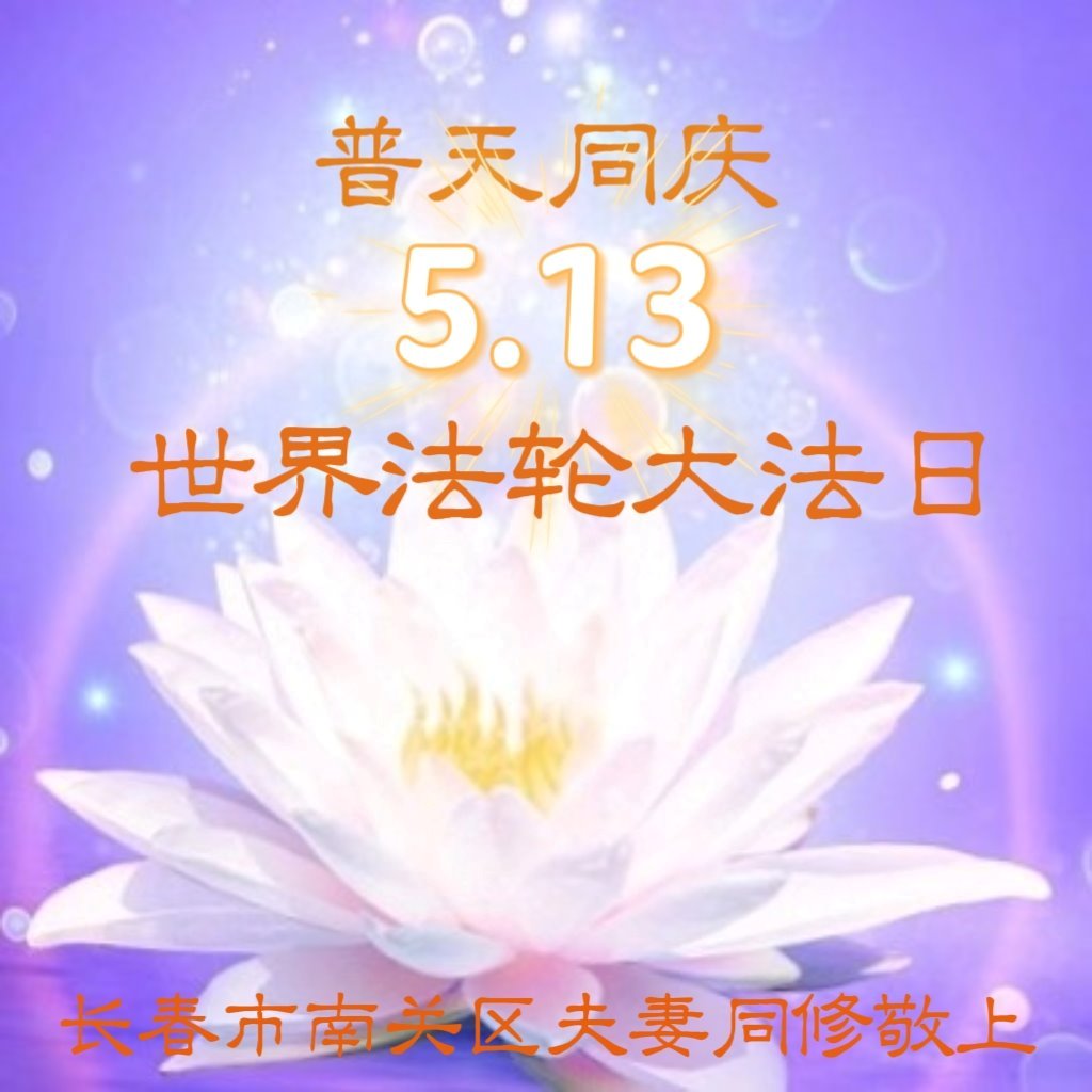 庆祝五·一三世界法轮大法日!这神圣、伟大、喜庆的日子,普天同庆。弟子要牢记师尊教诲,提高心性,修好自己,做一个合格的大法弟子。 吉林省长春市南关区一夫妻大法弟子恭祝慈悲伟大的师尊生日快乐暨世界法轮大法日!