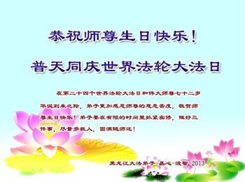 黑龙江伊春友好一大法弟子恭贺法轮大法日!恭祝师尊七十二岁华诞!