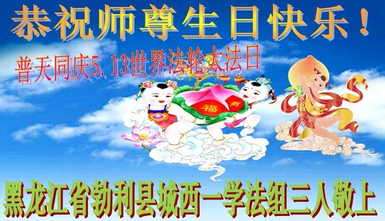 黑龙江省七台河市勃利县城西一学法组三人恭祝慈悲伟大的师尊生日快乐!普天同庆5.13世界法轮大法日!