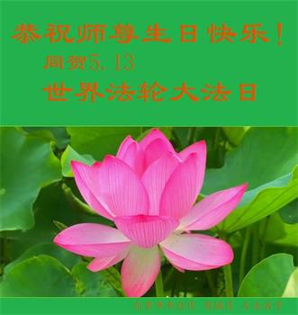 师父您辛苦了!在这个普天同庆日子里,弟子无限感恩师尊!在这正法的末后之末,弟子一定会勇猛精進,向内找,做好三件事,多救人,多发正念,带好俩个大法小弟子,坚定到底!让师尊少一份操劳多一份欣慰,跟随师尊回到新宇宙美好殊胜的崭新家园! 北京大法弟子恭贺五·一三世界法轮大法日!跪祝师父生日快乐!感恩慈悲伟大的师父!